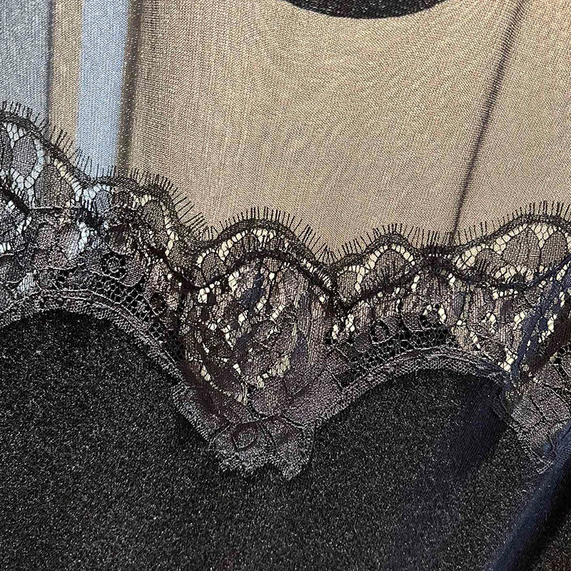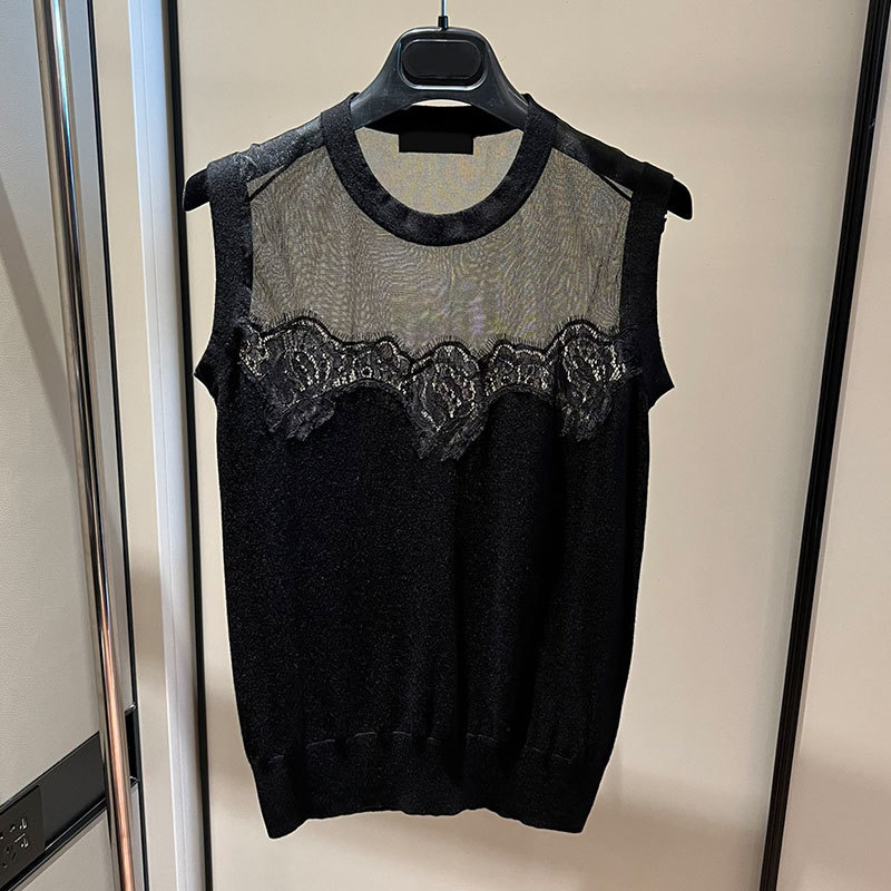 22 Black Knit 3 Piece Set Women Silk Cashmere perspective V-Neck Cardigan O-neck Sleeveless Lace Vest Long Sleeve Pullover A0307