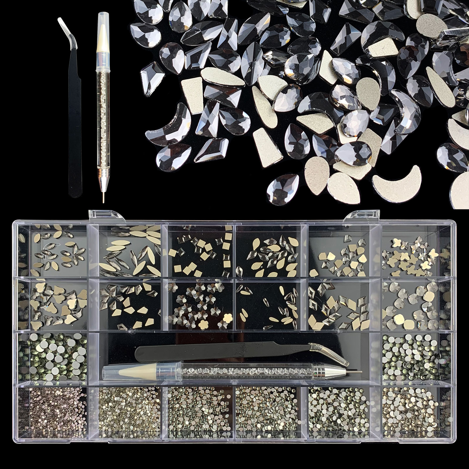 2). 2740pcs Rhinestone set: 240pcs(20x12) k9 crystal glass rhinestones, 2500pcs mix sizes round rhinestones,1pcs wax pen(Crystal or white), 1pcs tweezers for free