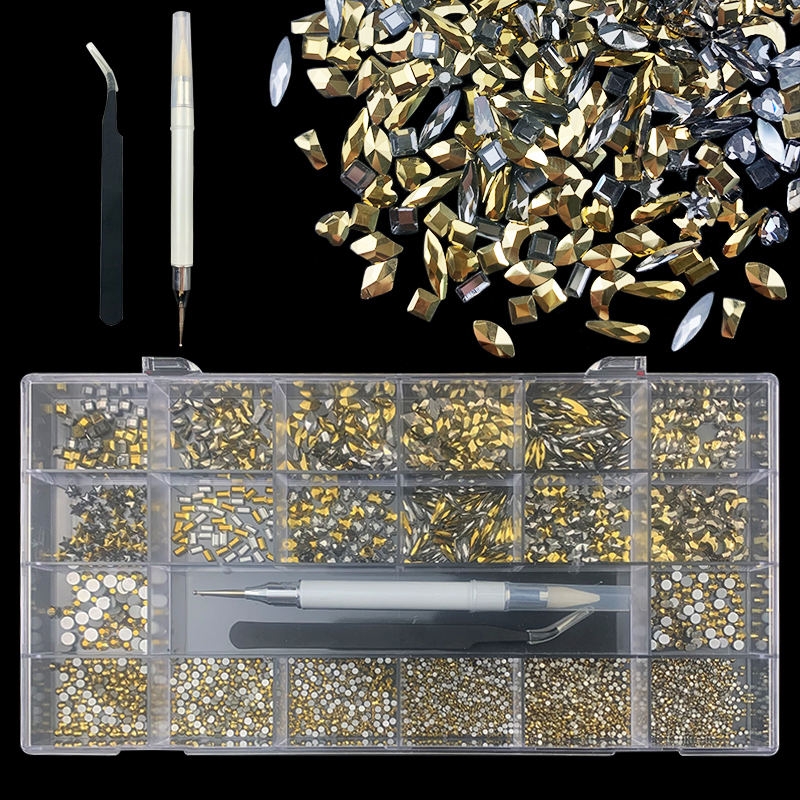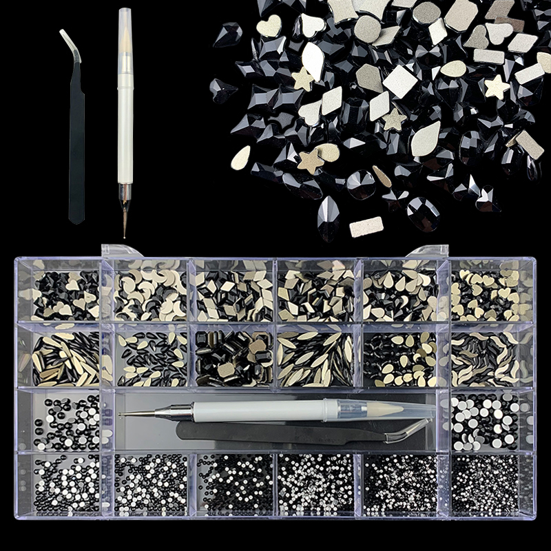 1). 2500pcs Rhinestone set: 300pcs(25x12) k9 crystal glass rhinestones, 2200pcs mix sizes round rhinestones, 1pcs wax pen(Crystal or white), 1pcs tweezers for free