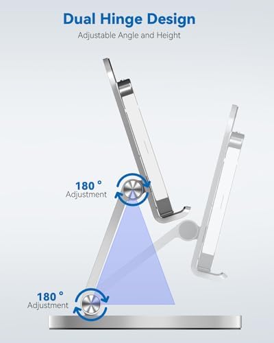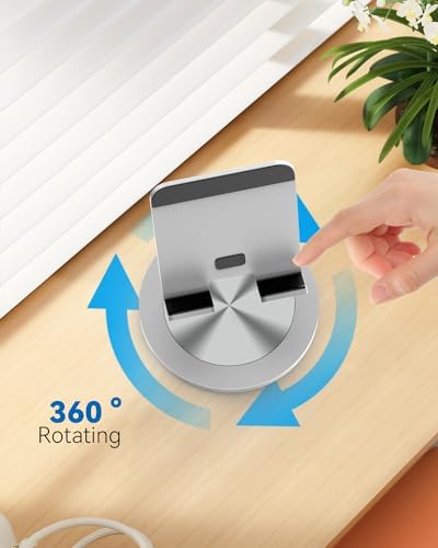 360 Rotating Phone Stand for Desk, Dual-Adjustable Foldable Aluminum Desktop Phone Holder Compatible with iPhone 15 14 13 12 11 Series, iPad-Mini, 4-8" All Phones (Silver)
