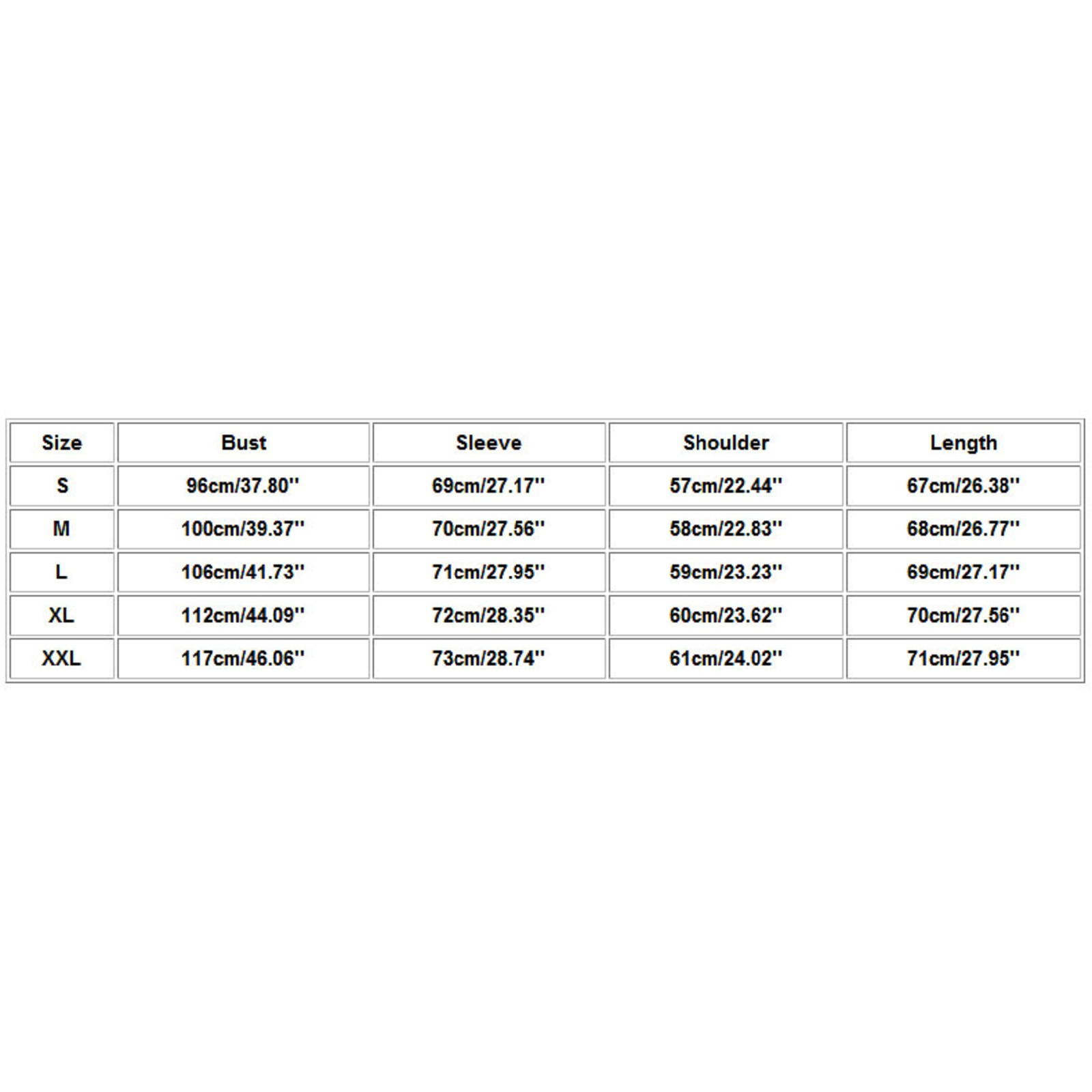 | Size | Bust | Sleeve | Shoulder | Length |