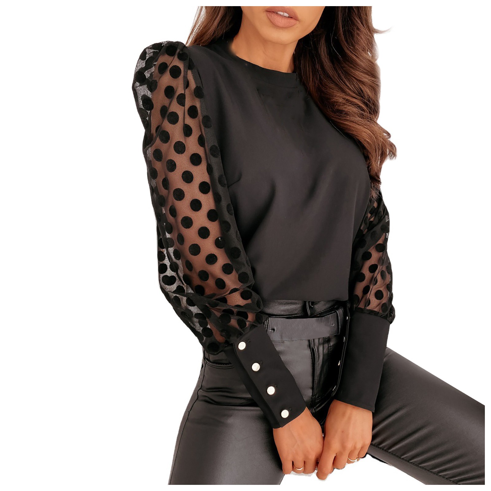 Womens O-Neck Lace Stitching Puff Long-Sleeved Casual Loose Shirt Daily Tops