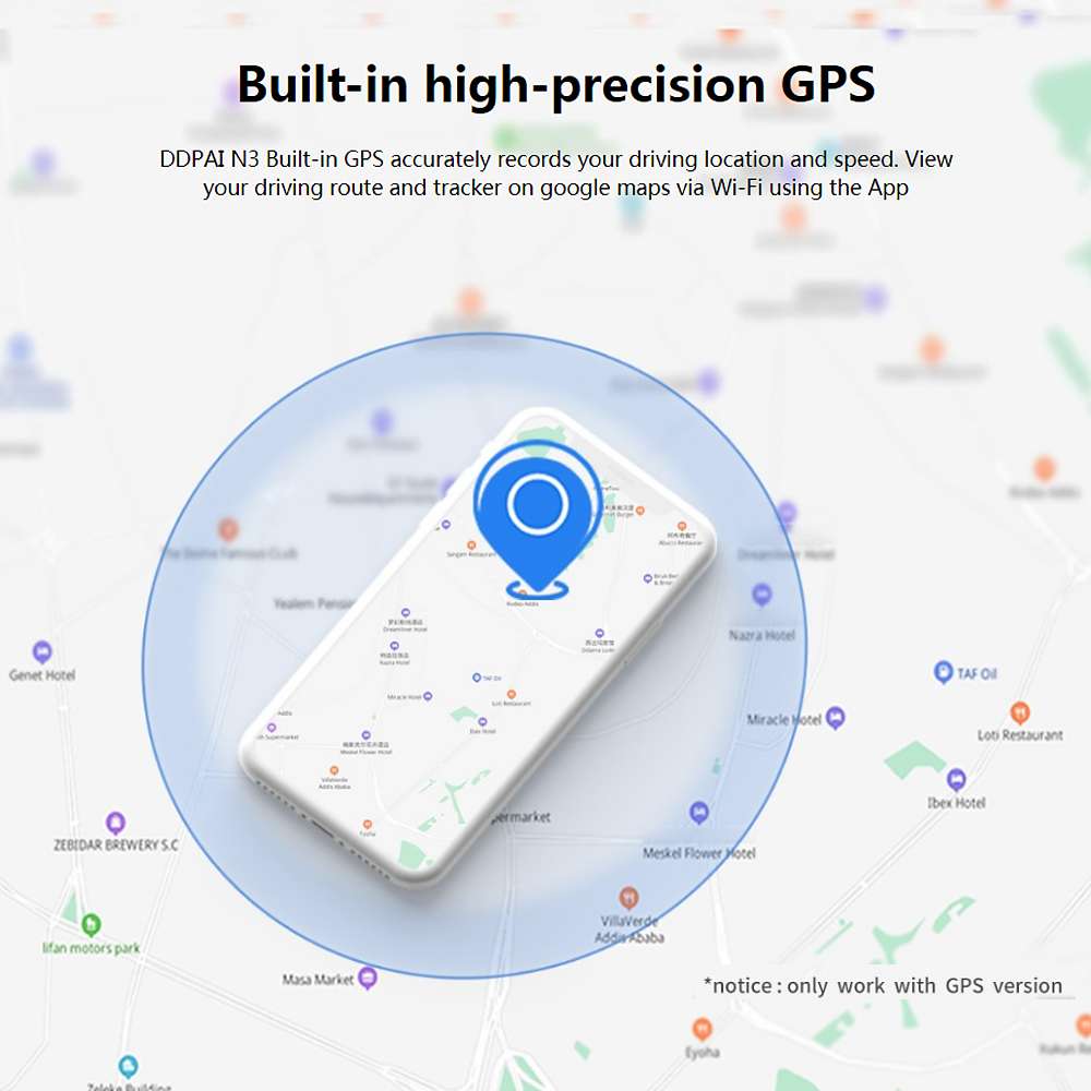 DDPAI N3 Built-in GPS accurately records your driving location and speed. View your driving route and tracker on google maps via Wi-Fi using the DDPAI App.