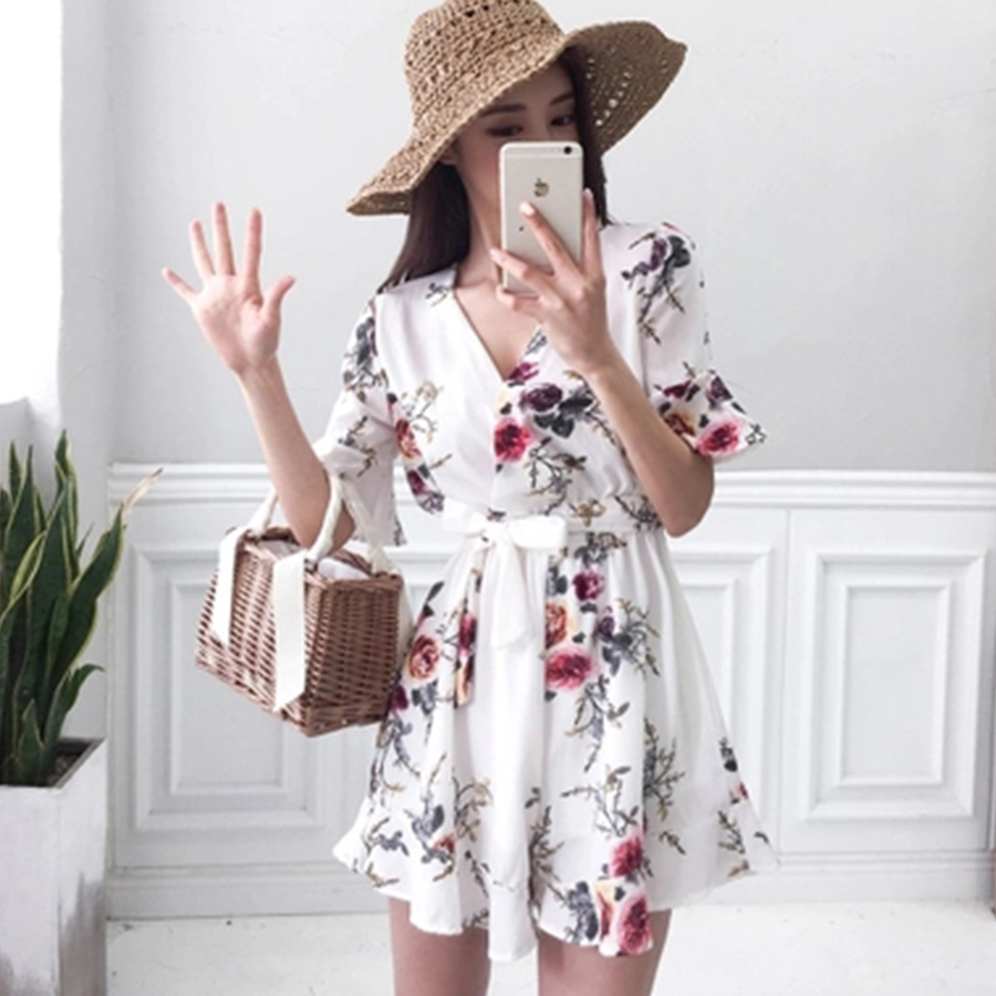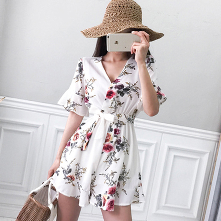 Features: Flower Chiffon Sexy Jumpsuit Women V-Neck Print Beach Playsuit Female Short Overalls Jumpsuit Casual Boho Bodysuit