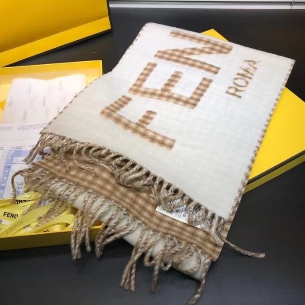 This timelessly elegant and luxurious Fendi scarf in soft wool and cashmere with Fendi Roma oversized lettering, lined with checked motif. Fringed hem, Its long, narrow shape enables it to be worn in many different ways.