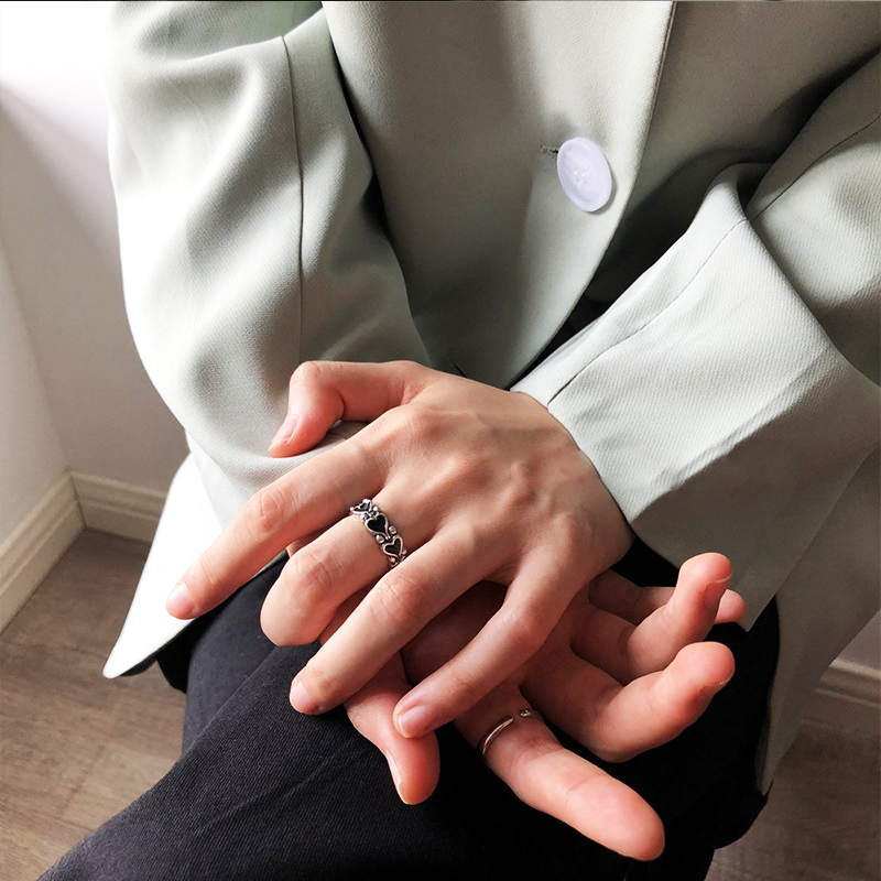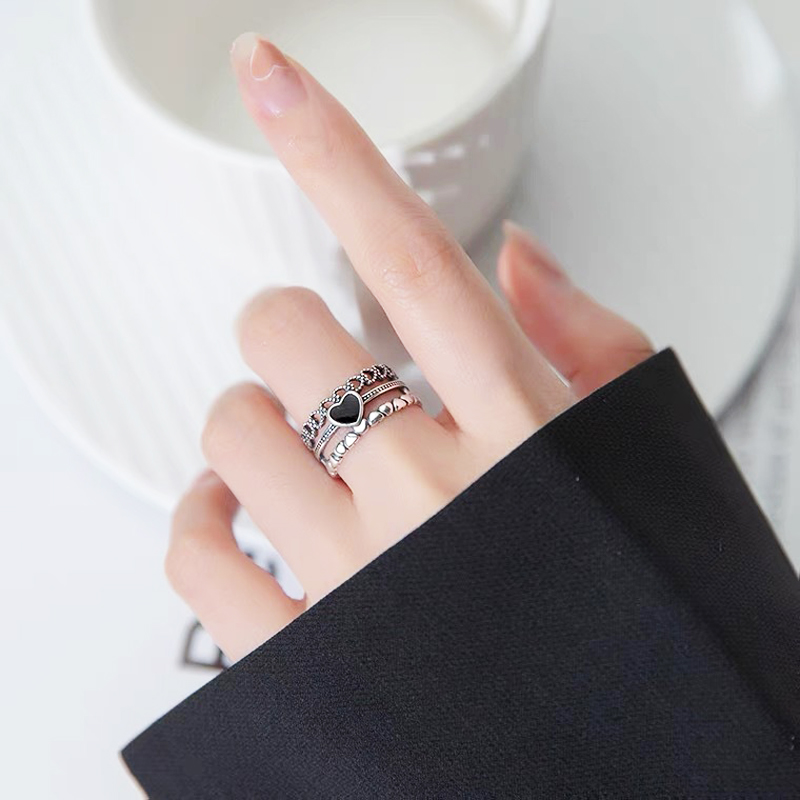 Goods : Korean ins trendy heart-shaped combination ring for men and women personality simple black love hollowed out adjustable