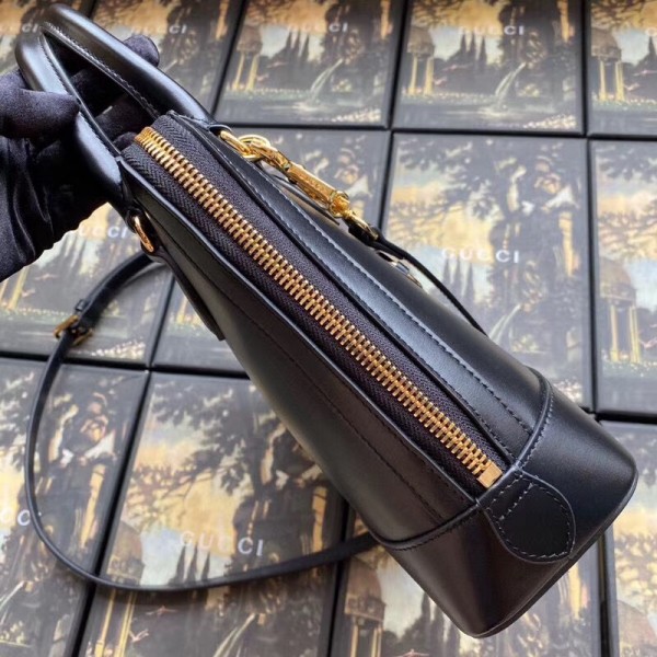 A new silhouette introduced to the Gucci 1955 Horsebit line for Spring Summer 2020, the top handle has a domed shape with an optional leather shoulder strap, crafted from black leather. The collection unifies details first introduced on the original bag that inspired the line from over six decades ago with a modern spirit, highlighting the Horsebit. Part of Gucci’s genetic code, the double ring and bar design has been established as one of the most distinctive elements among the House symbols borrowed from the equestrian world.