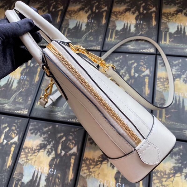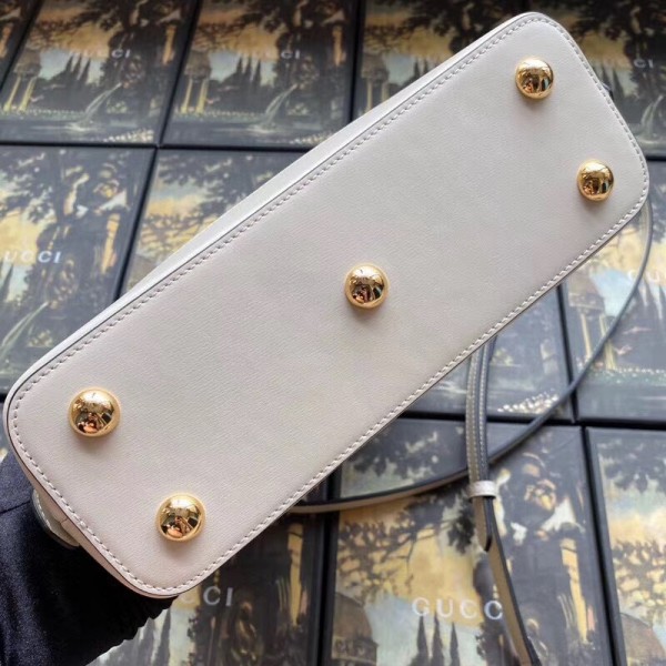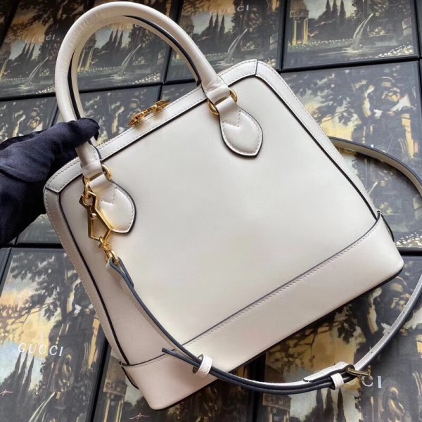 A new silhouette introduced to the Gucci 1955 Horsebit line for Spring Summer 2020, the top handle has a domed shape with an optional leather shoulder strap, crafted from white leather. The collection unifies details first introduced on the original bag that inspired the line from over six decades ago with a modern spirit, highlighting the Horsebit. Part of Gucci’s genetic code, the double ring and bar design has been established as one of the most distinctive elements among the House symbols borrowed from the equestrian world.