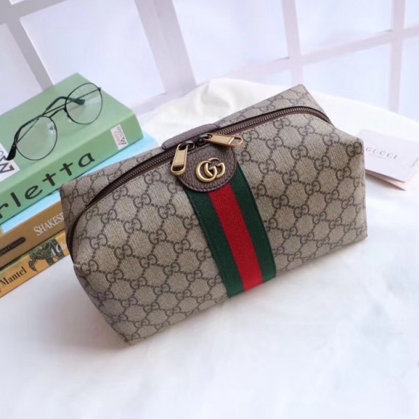 Introduced within the Ophidia line, the toiletry case is crafted from GG Supreme canvas combined with the distinctive combination of the House Web with Double G. The interior of the zippered pouch is lined with resistant nylon, completed with an open pocket.