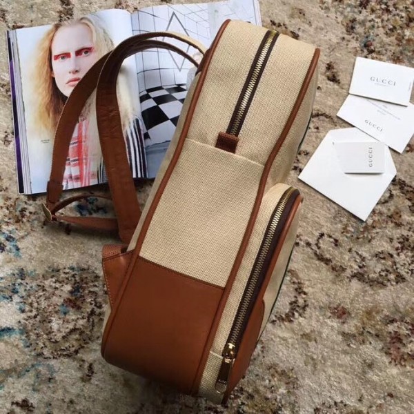 The classic backpack shape blends vintage appeal with traditional House codes in a softly structured shape. The distinctive Web is presented against beige canvas—a bi-colour woven fabric with a slight aged effect that enhances a vintage appearance. The rectangular shape is trimmed with leather and a small Interlocking G in gold-toned metal. New shapes and signature Gucci lines are reimagined in a mix of fabrics and trims imbued with an inherently summer feel.