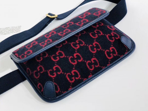 The belt bag is presented in blue and red GG wool—a contemporary interpretation of the original 1930s design, the distinctive fabric is displayed throughout the Cruise 2020 ready-to-wear and accessories. Trimmed with textured blue leather, the rectangular shape has a magnetic flap closure and an adjustable Web strap.