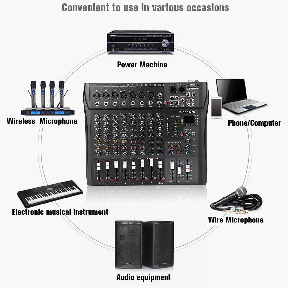 - Intelligent compatibility with various devices: wireless microphone, power-amplifier, mobile-phone, computer, electronic instrument, wired microphone, audio