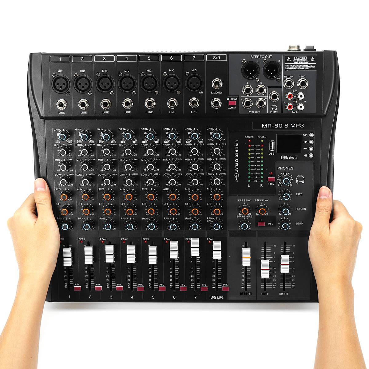 - 9 group mono track input, high-quality microphone amplifier