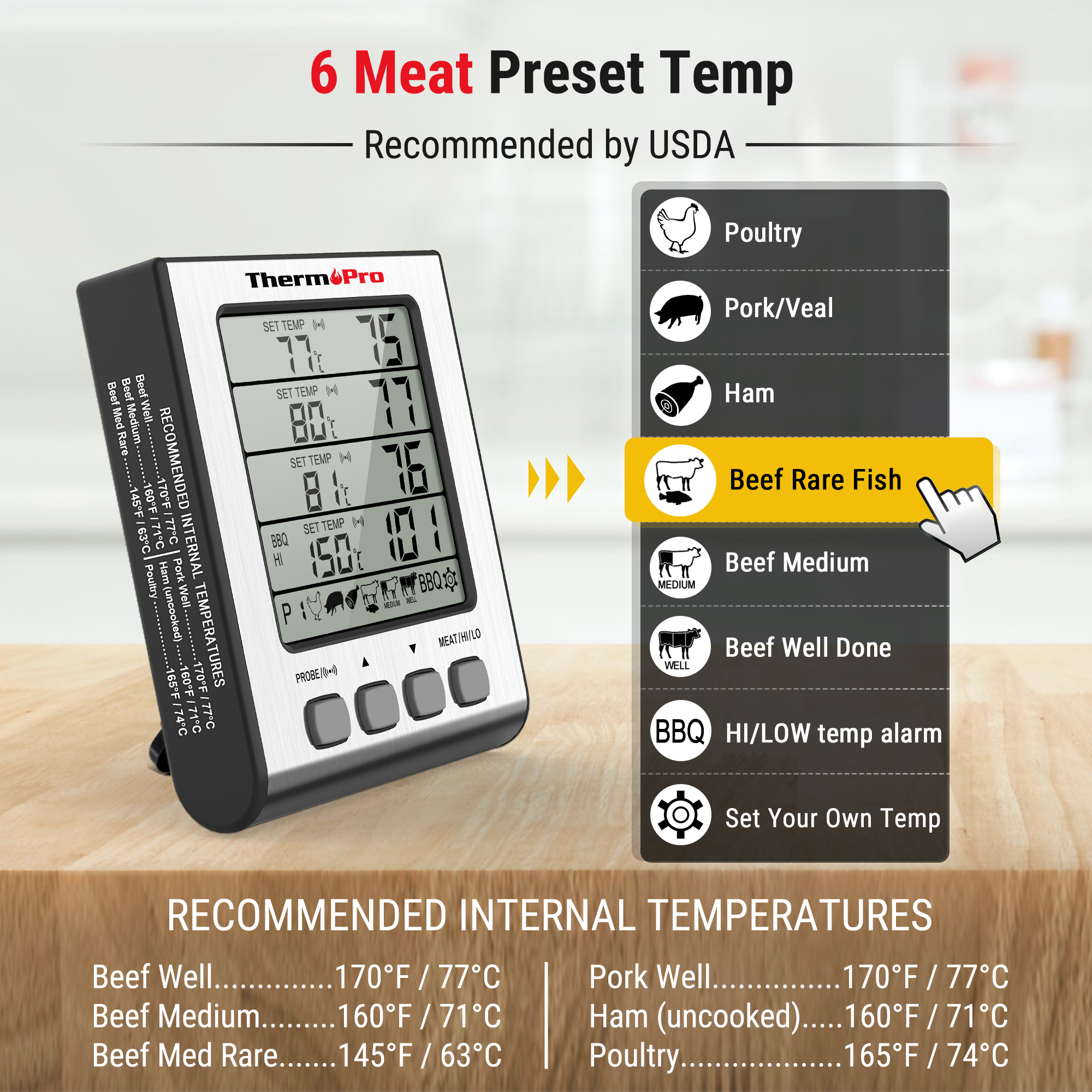 TP17H have preseted 6 meat (Poultry, Pork/Veal, Ham, Beef Rare/Fish, Beef Medium, Beef Well Done) temperature, which is recommended by USDA for specific foods.