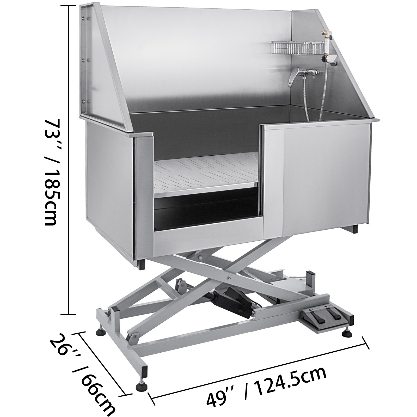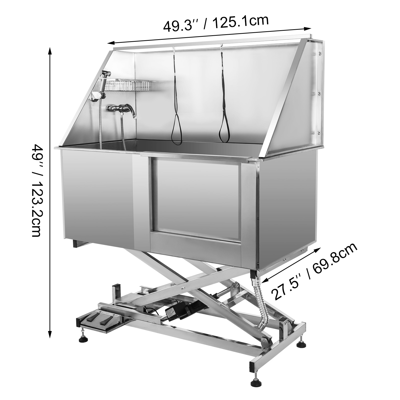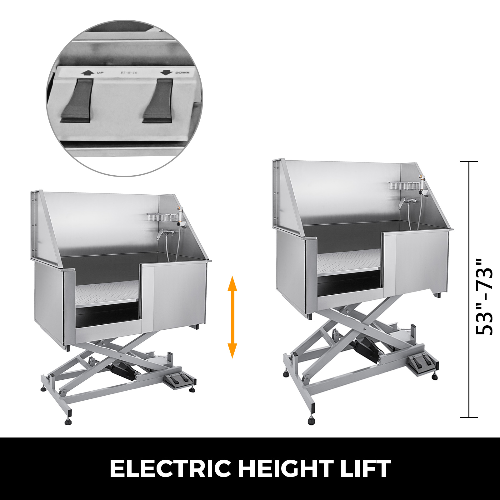 This dog bathing tub is equipped with electric motor for steadily height adjust(range:53-73"). Just step the "up" & "down" pedals at bottom, it will auto stop at any height you want.