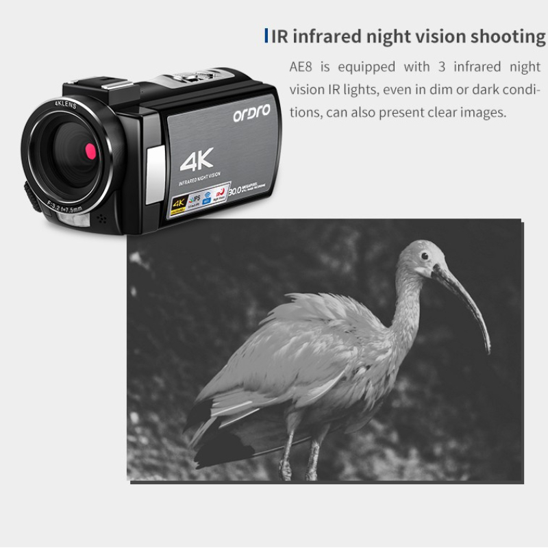 Video Camera 4K Professional Ordro AE8 Vlog Youtube with IR Night Vision Microphone Digital Camcorder Blogger Filmadora