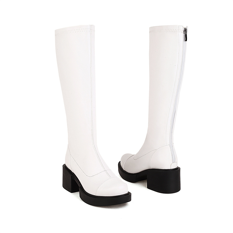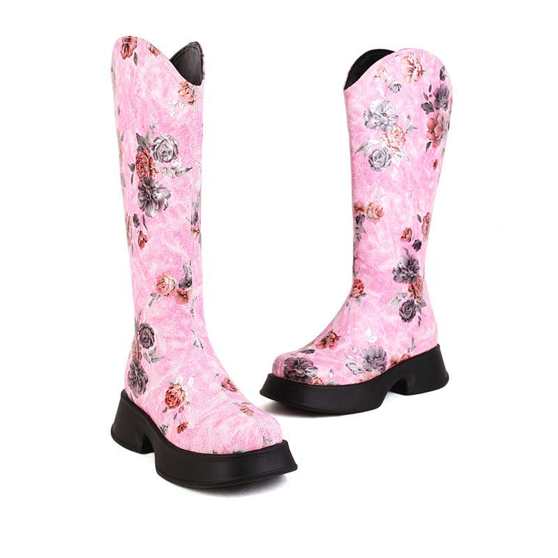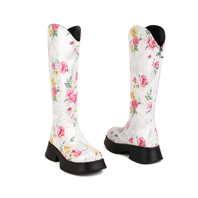 Women Boots 2022 Trend Luxury Winter Retro Round Head Small Platform Women Shoes Casual Mid Heel Print Ladies Knee High Boots