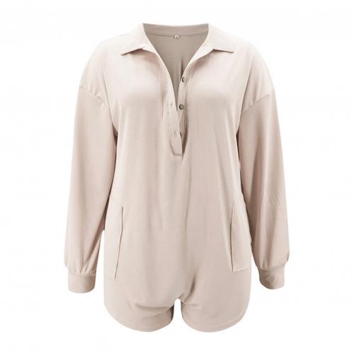 Women Solid Color Turn Down Collar V Neck Pocket Romper Spring Autumn Playsuit