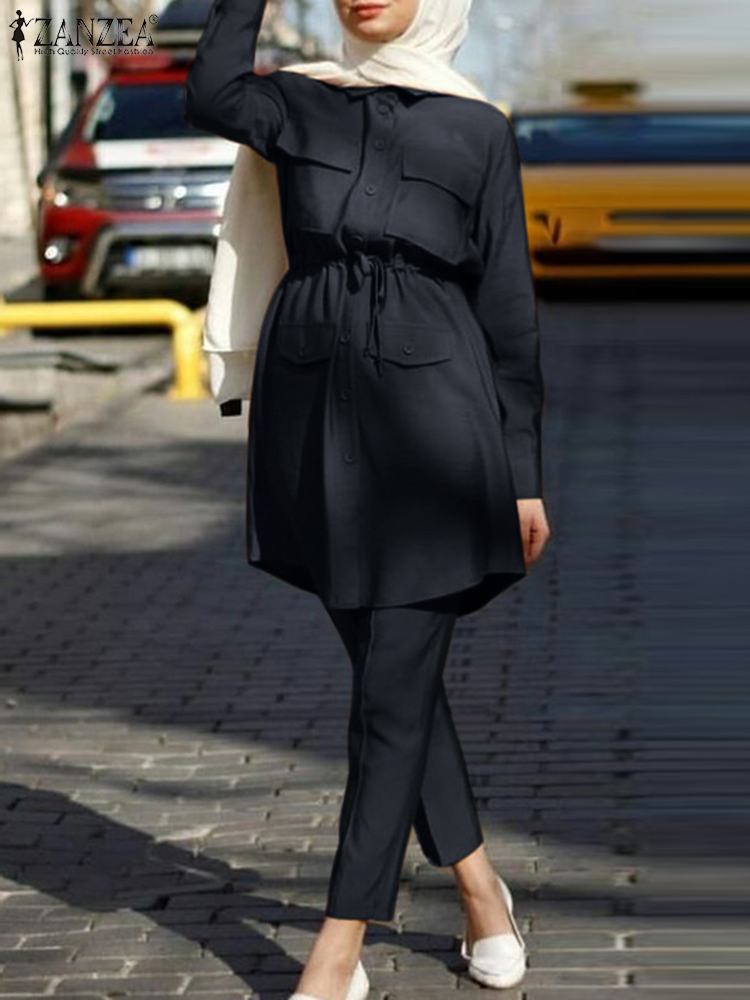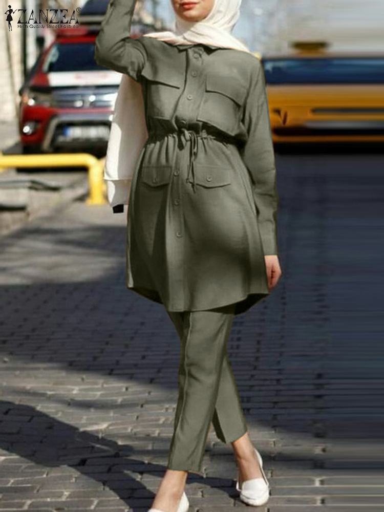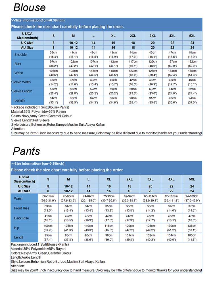 Package included:1 Suit(Blouse+Pants) Material:35% Polyamide+65% Rayon Colors:Navy,Army Green,Caramel Colour Sleeve Length:Full Sleeve Neckline:Turn-Down-Collar Pattern:Solid Color Length:Ankle Length Buckle chain:Button Down Front,Button Cuffs Waistline:Elastic waist Thickness:Thin Decoration:Front Pockets Features:Draw string waist Style:Leisure,Bohemian,Retro,Europe,Muslim Suit Abaya Kaftan Season:Spring,Summer,Autumn,Winter Occasion:Family,Party,Beach,Wedding,Holiday,Employment Label: Yes Attentions: 1.The Real Object May Exist Slightly Colors Differences Compared To Images As Different Computers Display.Caution If Minding,Thanks. 2.There Might Be A Manual Measuring 1-3 cm Error.Sorry For Any Inconvenience. 3.Please Prevail On Real Item, Model Images For Reference Only. 4.Attention!!!Please check the size chart carefully before placing the order.