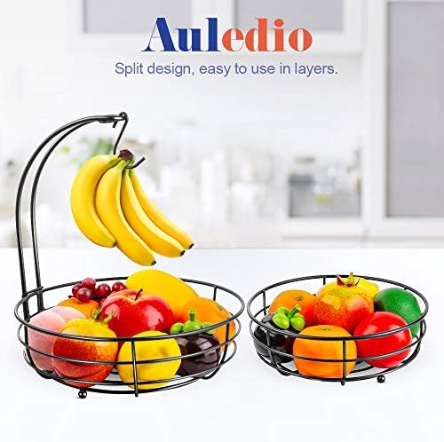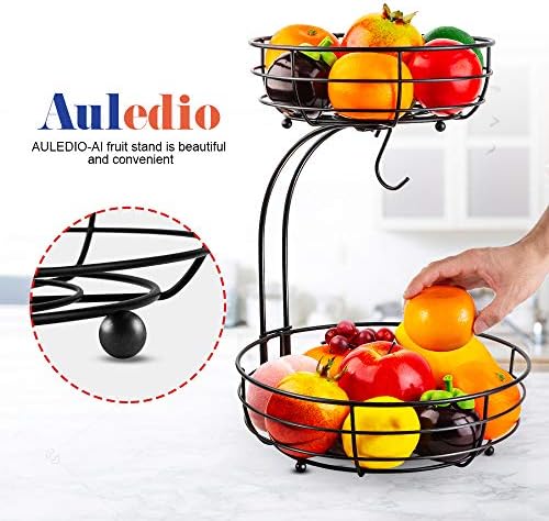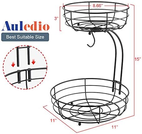 Auledio Iron 2-Tier Countertop Fruit Vegetables Basket Bowl Storage With Banana Hanger, Black, 64 ounces