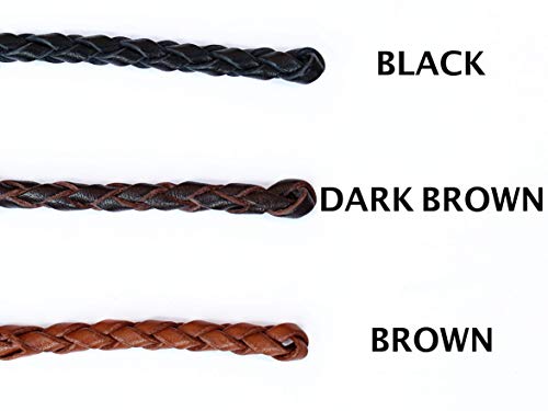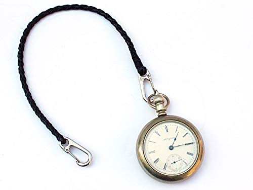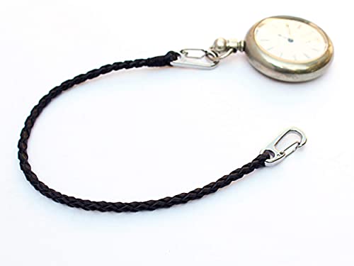 WATCH NOT INCLUDED Our braided leather pocket watch chain keeps your watch secure and easily accessible. Having a chain made from leather is lighter and more comfortable to wear than metal. Top quality stainless steel clasps can connect to your belt loop, bag, etc. Hand braided genuine leather lacing. Measures 13 inches (33 cm) in total length. Available in black, dark brown, and brown. American made. Now included is a leather bow protector. You do not need to purchase this separately. This piece of leather can be used to protect the bow of your watch from rubbing against the metal of the pocket watch chain clip. Can also be used if the clip is not fitting on the bow. Leather is high quality and is about 3mm in thickness.