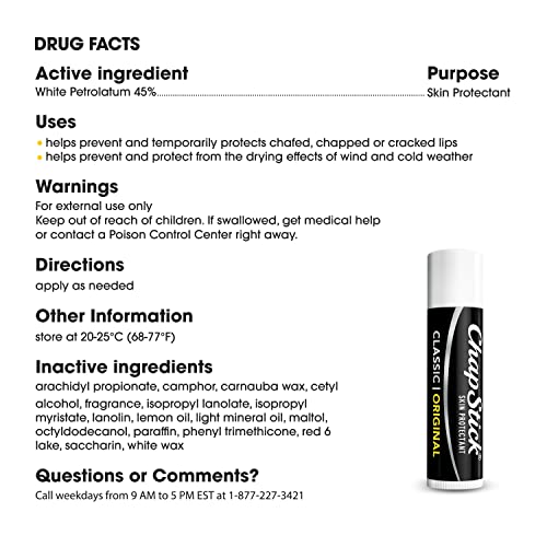When it comes to caring for your lips, you can't go wrong with a classic. ChapStick Classic Original is the one you know and love. It's the lip protection you grew up with, that trusted tube you've turned to time after time. America's favorite lip balm, ChapStick Classic Original for lips glides on easily to soften and protect delicate skin. Use as directed to help heal or prevent dry, chapped lips, and apply it daily to help keep lips silky smooth. Through every season, at home or on the go, trust ChapStick Classic Original lip balm for everyday comforting lip care. ChapStick Classic is available in Original, Cherry, Strawberry and Spearmint varieties. ChapStick - Skincare for Lips.