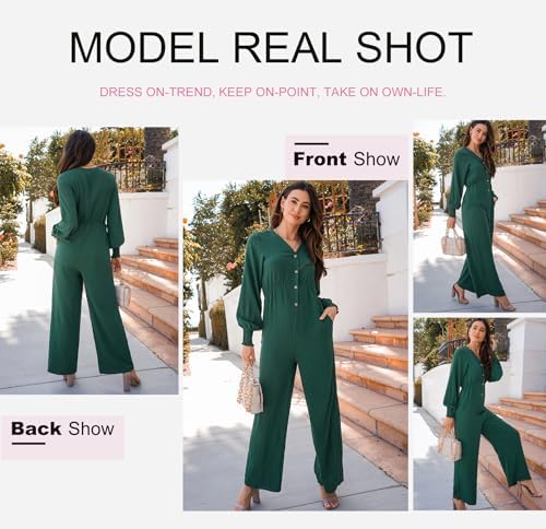 Casual jumpsuits for women features v-neck, button up, long sleeve, high waist, side pockets and wide leg. Classic and chic style.