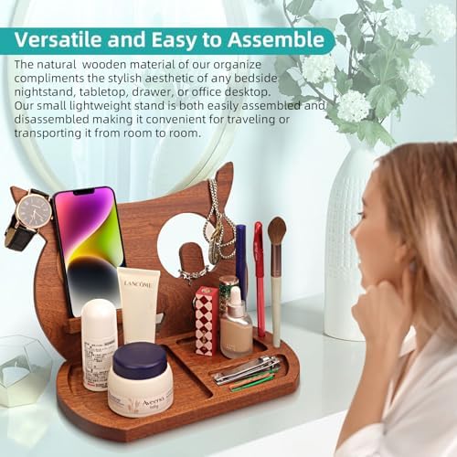 Handmade Wooden Phone Base Finishing Desk Charging Station Mobile Phone Holder Tablet Glasses Wallet Tray Unique Creative Gift (Brown)