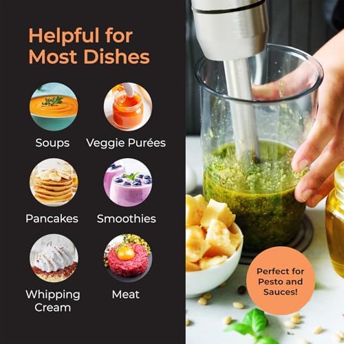 And your baking! These MuellerLiving Blender Stick attachments will help speed up your kitchen tasks: Blending Shaft, Beaters (batter, dough), Chopper (meat, cheese, salad, salsa, onion and nut chopper), Whisk (egg whites, cream), Mixing Hooks, Milk Frother and Potato Masher.
