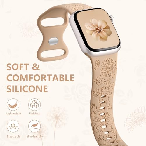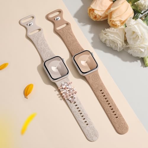 Maledan 2 Pack Flower Engraved Band Compatible with Apple Watch Bands 40mm 41mm 38mm 44mm 45mm 49mm Women Men, Soft Silicone Sport Band with Decorative Charms for iWatch Series 9 8 7 6 5 4 3 2 1 SE