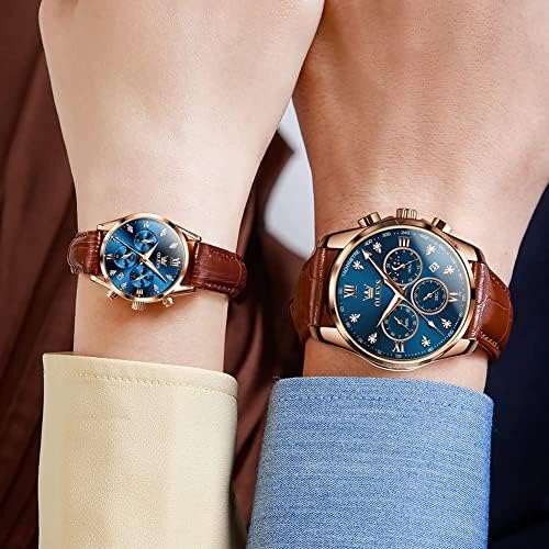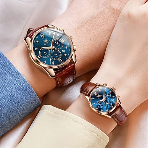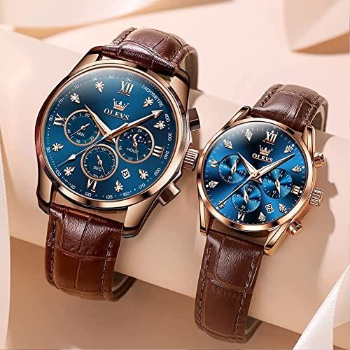OLEVS Valentines Couple Pair Quartz Watches His and Her Couple Set Leather Chronograph Diamond Wrist Watch Men Women Lovers Wedding Romantic Gifts Set of 2
