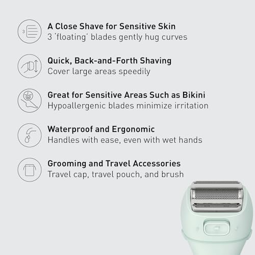 Enjoy a safe, gentle shave with the Panasonic Shaver for women ES-AWL6AG. Three ultra-sharp floating blades and outer foils hug your curves, for a silky-smooth, close shave. And, blades are made of hypoallergenic stainless steel for less irritation, even on sensitive skin. The unique blade design allow you to shave backwards or forwards, to cover large areas more quickly. A pop-up womens bikini trimmer lets you shape and trim even your most sensitive areas precisely and gently. With this waterproof ladies razor you can shave and trim in or out of the shower, with an ergonomic handle that is easy to use even when wet. And, a neat charging stand eliminates messy charging cords. A full charge provides up to 35 minutes of use.