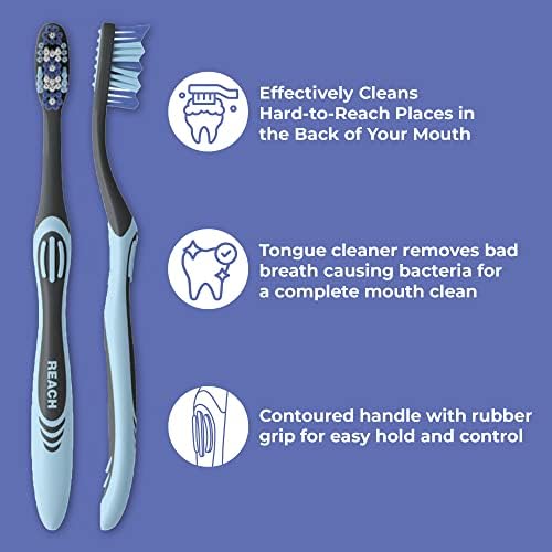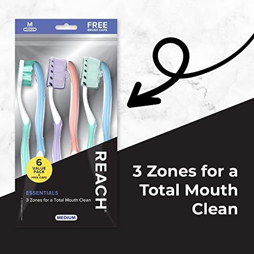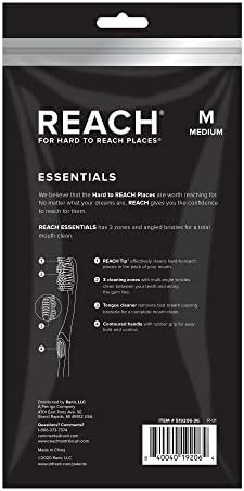 REACH Essentials Toothbrushes effectively clean the hard-to-reach places in the back of your mouth. Each toothbrush has a 3 zones of multi-angled medium bristles, along with an angled neck that helps remove plaque deep between teeth and along the gum line, allowing for a more comprehensive clean. The back of the toothbrush has a tongue scraper to help eliminate bad breath. REACH Essentials Toothbrushes also come with a contoured handle made of soft rubber and plastic for a comfortable cushion grip that’s easy to hold and control. Includes 6 toothbrushes with toothbrush covers to protect the bristles. Great for the entire family, these toothbrushes will consistently help maintain oral hygiene daily. Don't just brush, REACH!