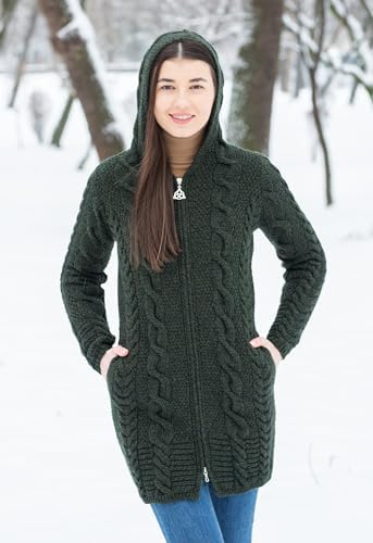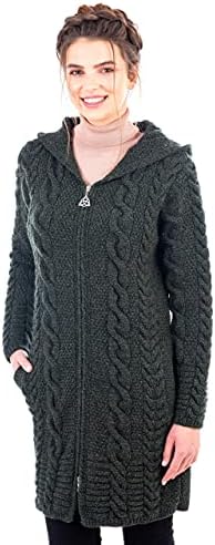 Stay warm and fashionable this fall and winter with this Aran Cable Knit Hooded Zip Cardigan. This Cardigan is made of 100% Merino wool, which will keep you insulated and comfortable outside in the cold with its warmth, moisture-wicking breathability, and rich softness. Giving this piece its fresh style versatility and practicality is a hoodie that can be worn up or down. The full zipper and side pockets also bring chicness and practicality, as the zipper is perfect for quickly layering up or down and the pockets are convenient for holding small items or warming the hands. This hoodie is perfect for everyday wear and will definitely become a wardrobe favorite!