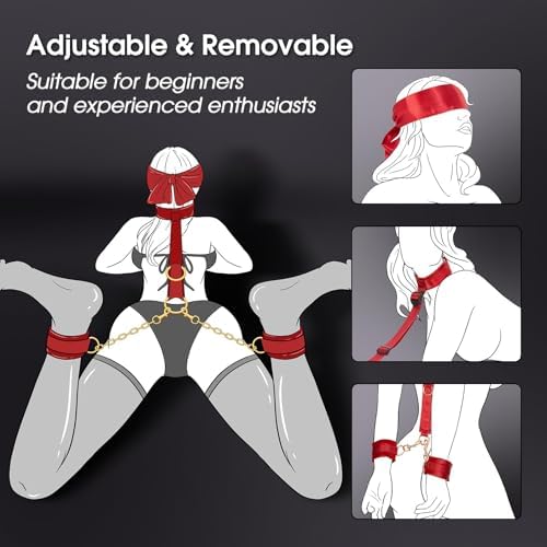Sex Restraints Kit - 6PCS Sets with Adjustable Handcuffs Thigh Cuffs Ankle Cuff Blindfold Cross Strap Waist Strap, BDSM Slave Gameplay Tools for Men Women and Couples (Red)
