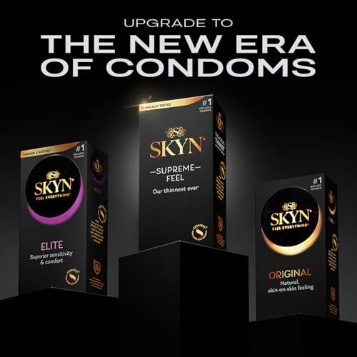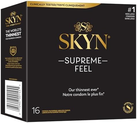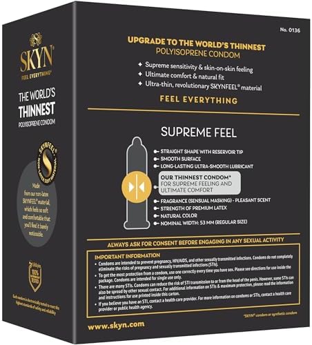 Upgrade to the new era of SKYN condoms with SKYN SUPREME FEEL and experience the ultimate comfort and natural fit. Made from our revolutionary SKYNFEEL material, these premium, polyisoprene lubricated condoms are our thinnest ever, and provide supreme sensitivity and skin-on-skin feeling with a long-lasting, ultra-smooth lubricant. They are non-latex, making them a great choice for anyone with latex allergies or sensitivities, and don’t have a rubber latex smell. SKYN’s SUPREME FEEL non-latex condoms are as strong as premium latex, tested to the highest safety standards of safety and reliability and are safe to use with water-based lube and silicone lube. Always ask for consent before engaging in sexual activity. SKYN FEEL EVERYTHING.