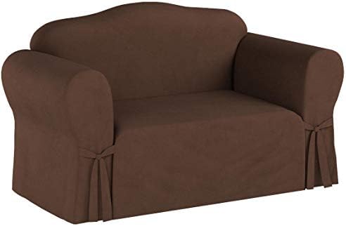 Sure Fit Home Décor Soft Suede Box Cushion Sofa One Piece Slipcover, Relaxed Fit, Polyester, Machine Washable. This upscale collection brings the luxury of suede down to earth, making it easy to care for and affordable. Designed for everyday use in a relaxed easy going fit. Fits most Sofas 74"-96" when measured across furniture outside arm to arm. Made with 100% polyester. Patented one-piece design in a relaxed straight skirt with ties. Machine wash separately in cold water on gentle cycle and tumble dry low. Do not use bleach. Warm iron as needed.