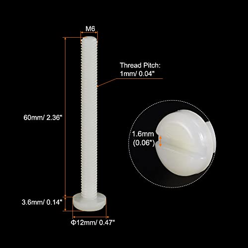 Description:1. Material: Made of nylon material, these slotted screws are anti-static, lightweight, have insulation, corrosion-resistant, no rust, and long service life.2. Wide Application: These plastic screws are suitable for use as fixing components, industrial and construction fasteners. Widely used in the wind power industry, aerospace industry, office equipment industry, electronics industry, communication industry, shipbuilding industry, and other machinery industries.3. Note: Please confirm the size of each screw before placing an order to avoid buying the wrong one.Specification:Color: WhiteMaterial: NylonThread Size: M6x60mmThread Pitch: 1mm/ 0.04"Drive Type: Slotted DriveHead Style: Slotted Pan HeadScrew Length: 60mm/ 2.36"Screw Head Size: 12 x 3.6mm/ 0.47" x0.14"(D*T)Package Content: 40 x Nylon Slotted Pan Head Screws