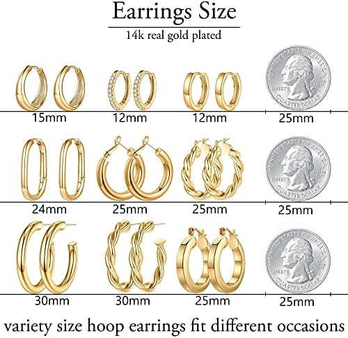 Yesteel 9 Pairs Gold Hoop Earrings for Women, 925 Sterling Silver Post 14K Real Gold Plated Chunky Hoop Earrings Set for Women Hypoallergenic Thick Lightweight Hoop Earrings for Women Gold Jewelry Gif