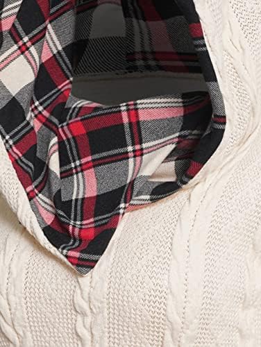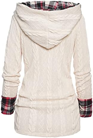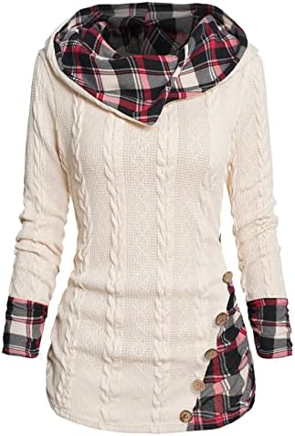 ZEZCLO Women's Twisted Cable Knit Plaid Print Hooded Sweater Mock Button Ruched Shawl Neck Sweater