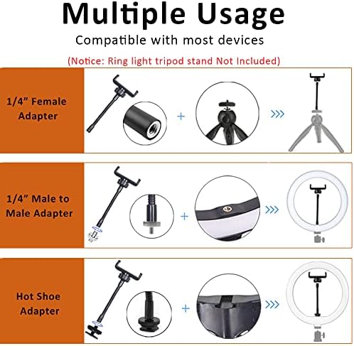 JCWINY Ring Light Phone Holder Attachment is mainly designed for ring light stands or any tripod stands. It is detachable and wide compatibility. The flexible neck with a 1/4’’ female screw hole can works with an additional 1/4” male to male adapter (Included in the package) or an additional hot shoe adapter (Included in the package) to fits more devices of different connectors. JCWINY phone holder also increases the versatility of the ring light. It can not only replace the original phone holder from the ring light fixtures but also allow to mount the phone or camera to the stand without having the ring light attached. With this flexible phone holder, you can unscrew the entire ring light and simply mount it on the fixture. Then you can stand your phone beside your chair and watch movies on it, or do exterior videos without that obnoxious light attached. This Phone holder for ring light is easy to install, lightweight but durable.