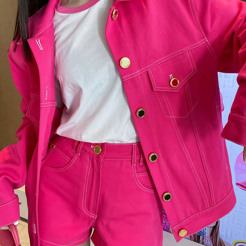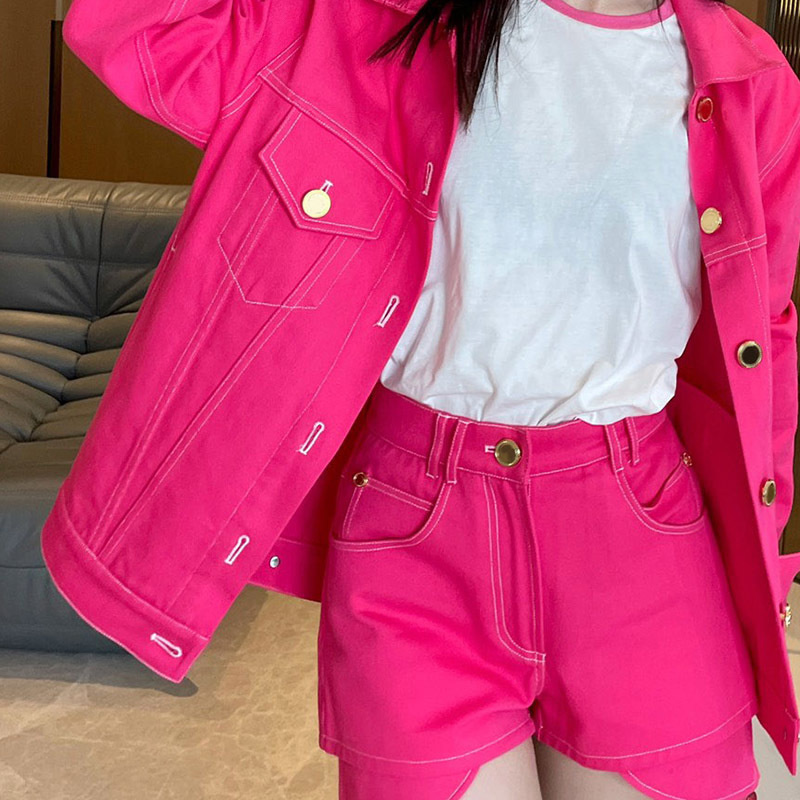 22 Fashion Pink Letters Denim Short Sets Women Luxurious Metal Single Breasted Lapel Jacket Sexy Slim Pocket Button Denim ShortsA0443