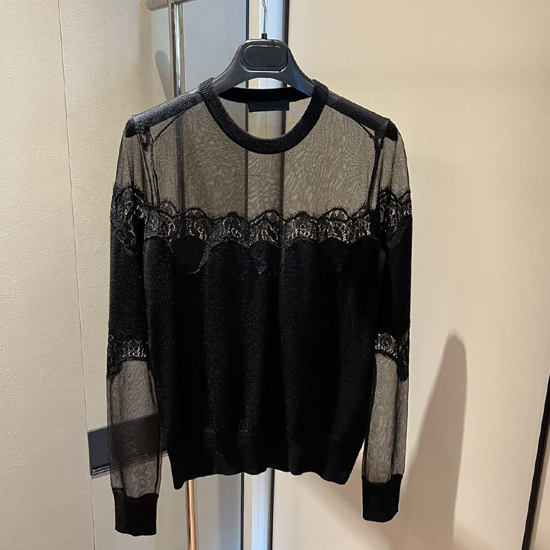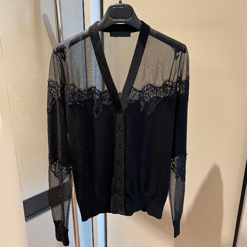 22 Black Knit 3 Piece Set Women Silk Cashmere perspective V-Neck Cardigan O-neck Sleeveless Lace Vest Long Sleeve Pullover A0307