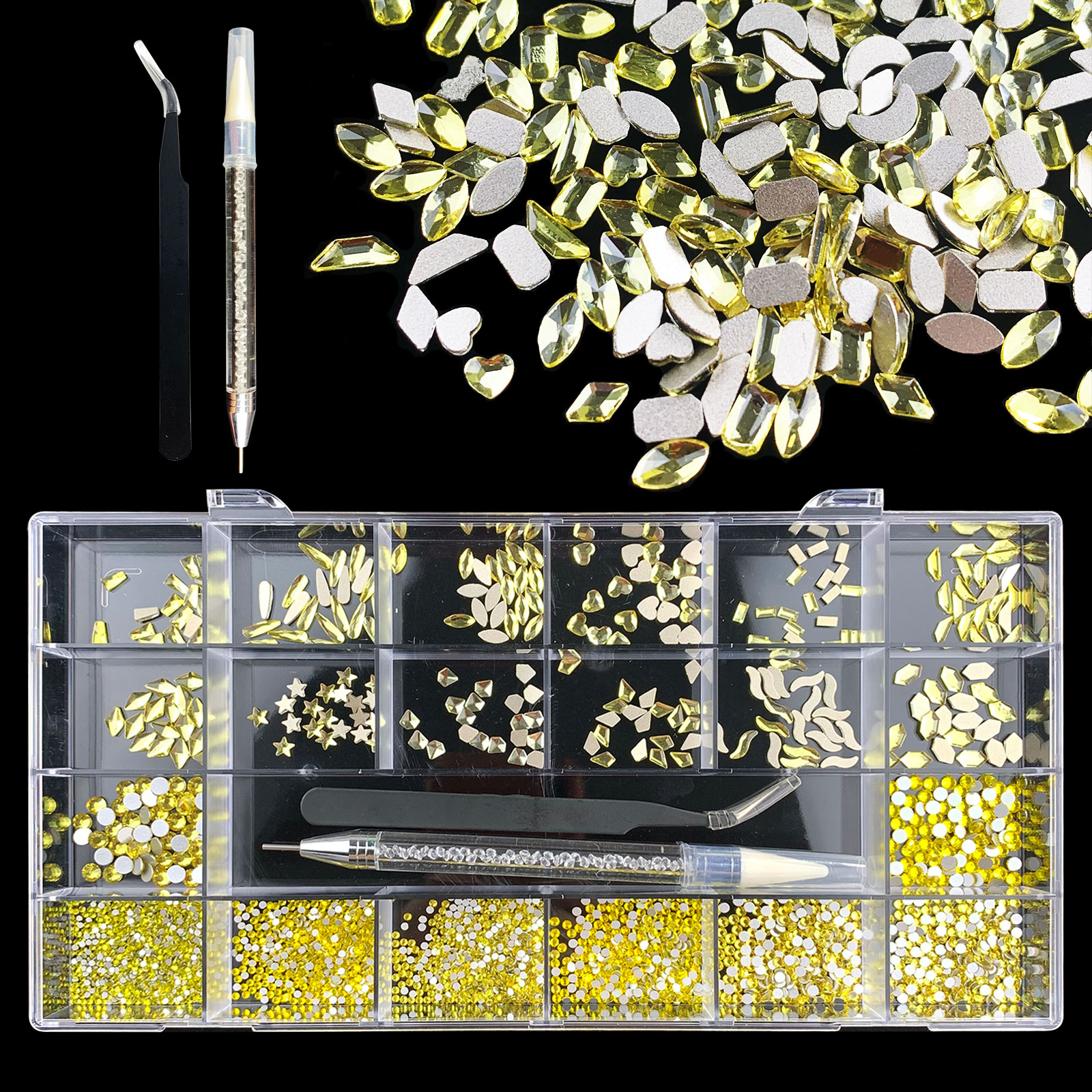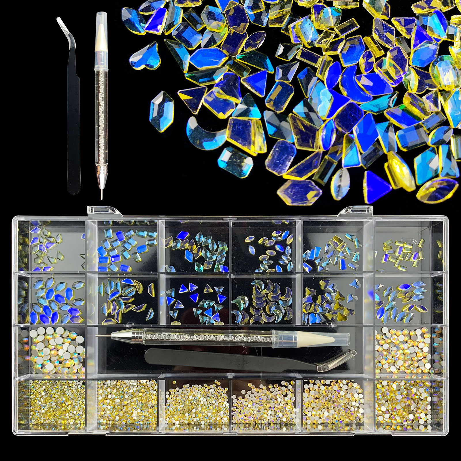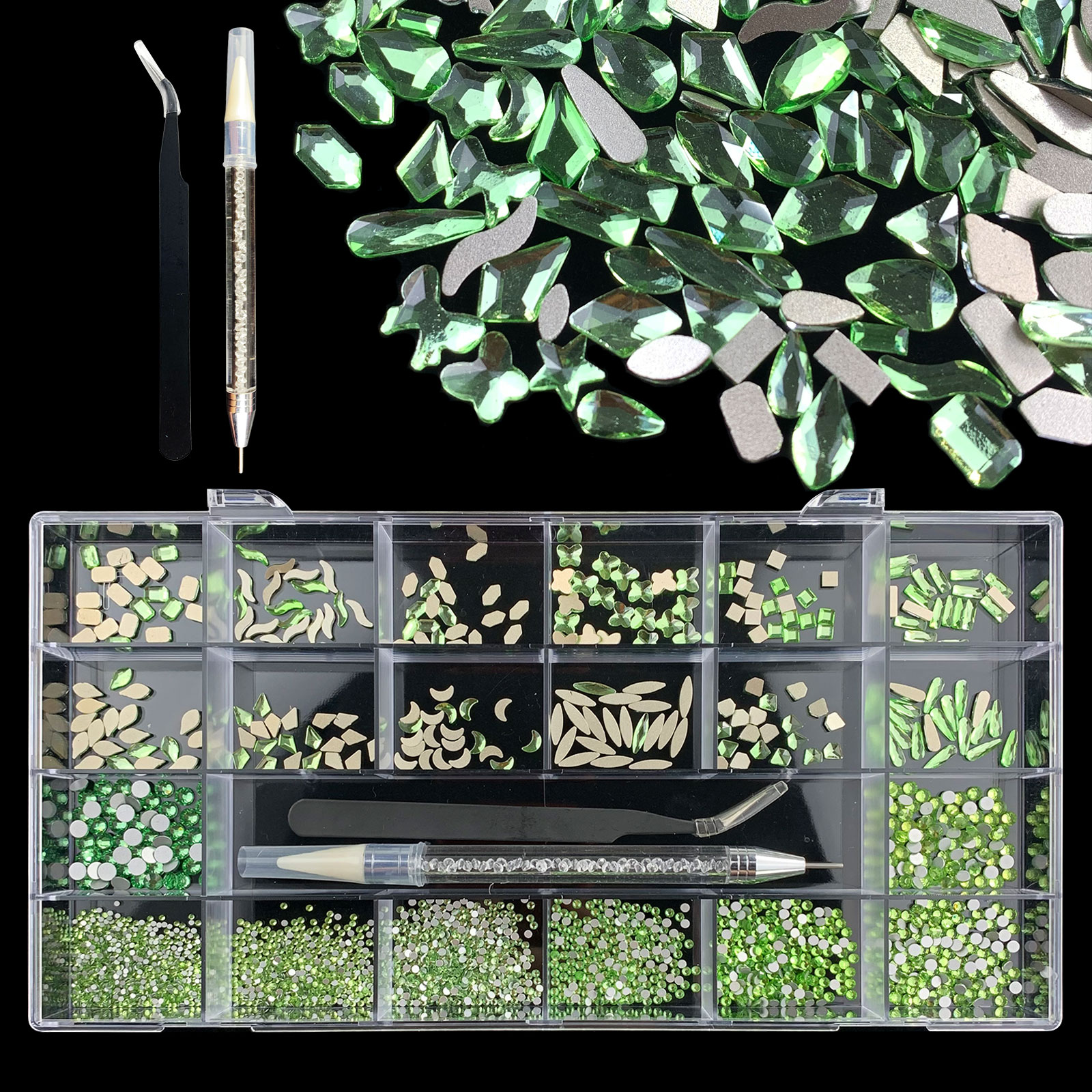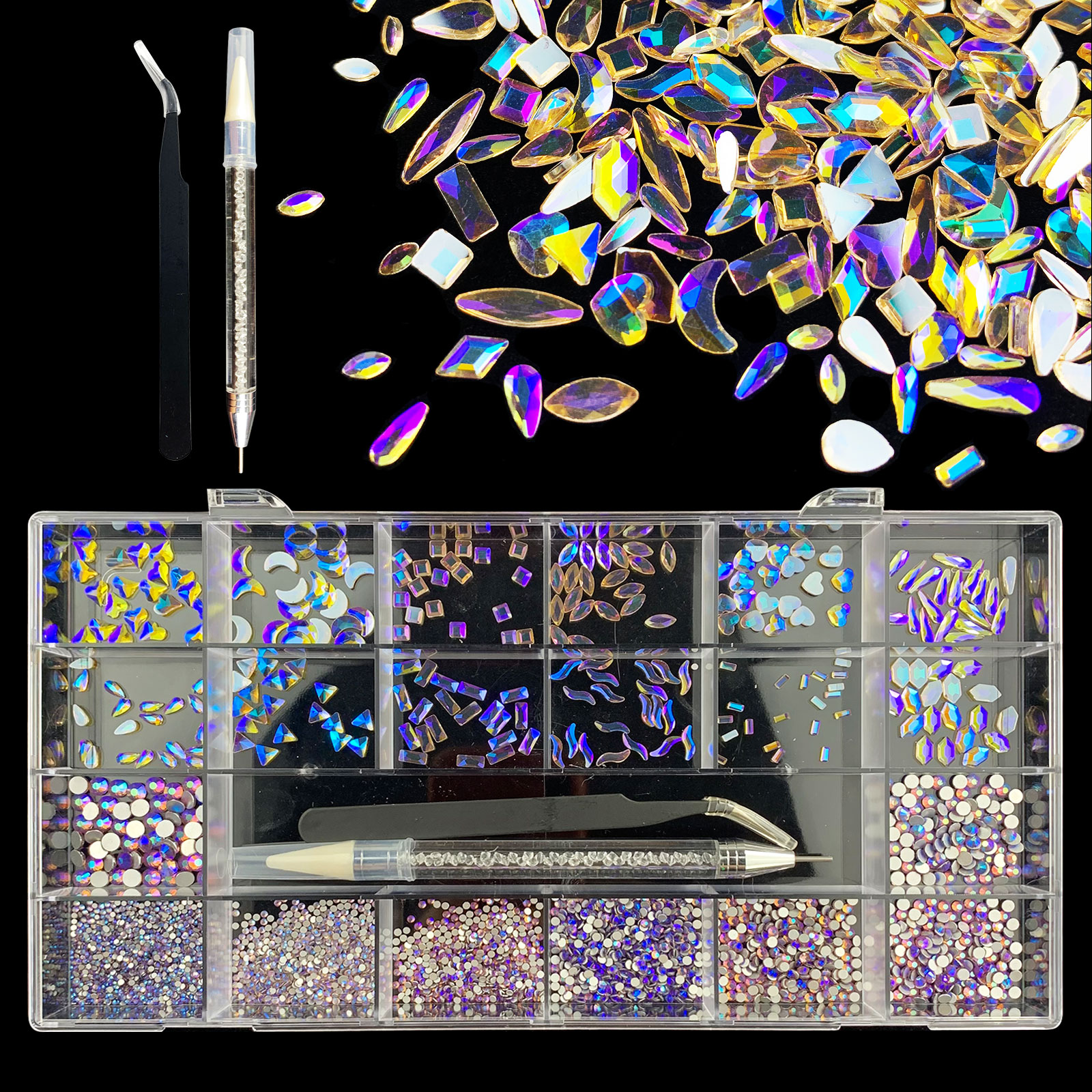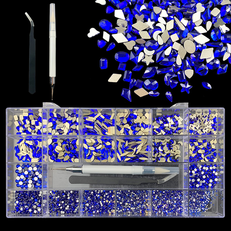 1). 2500pcs Rhinestone set: 300pcs(25x12) k9 crystal glass rhinestones, 2200pcs mix sizes round rhinestones, 1pcs wax pen(Crystal or white), 1pcs tweezers for free