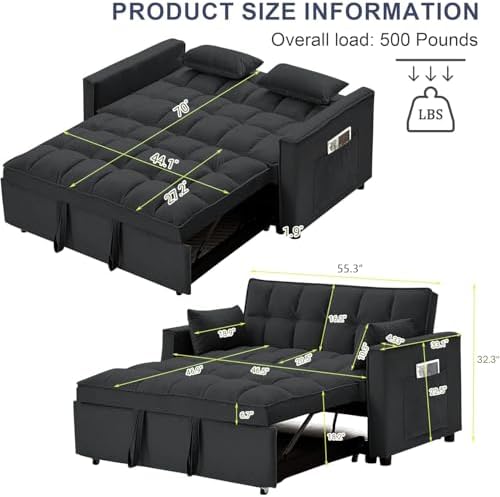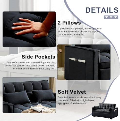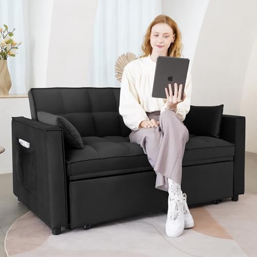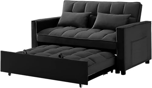 3-in-1 Pull Out Couch, 55.3'' Convertible Futon Sofa Bed, Velvet Sleeper Loveseat with Pillows, Pockets, Small Sofa Cama for Living Room, Apartment, Black