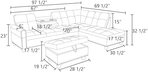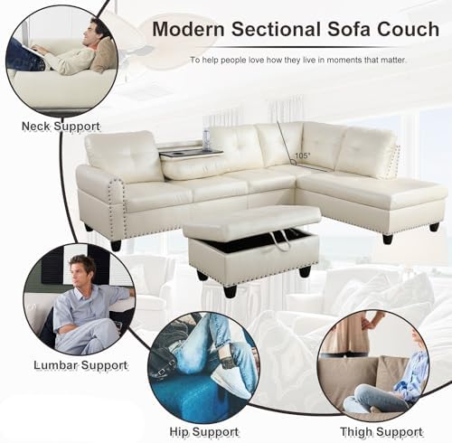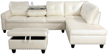 Our L-Shaped Modular Sectional Couch with Storage Ottoman is designed for ultimate convenience and style. The storage ottoman offers ample space to keep your living area organized, while the premium faux leather ensures a luxurious and durable finish. The sectional includes a foldable console with cup holders, making it easy to enjoy beverages and snacks without spills. With a modern button-tufted design and sturdy construction featuring thick foam cushions, a cozy chaise, a durable wood frame, and sleek metal feet, this sofa set seamlessly blends with traditional and contemporary décor, enhancing the elegance and comfort of any room.✨ 3-Piece Sectional Couch Sofas✨ Functional Storage Ottoman: Provides ample space for blankets, pillows, and other essentials, while also serving as additional seating or a footrest.✨ Premium Faux Leather: Offers a stylish and luxurious appearance, ensuring durability and easy maintenance.✨ Foldable Console with Cup Holders: Conveniently holds drinks and snacks, enhancing relaxation without the worry of spills.✨ Modern Luxurious Design: Showcases button-tufted upholstery with clean lines and elegant White faux leather, blending seamlessly with various décor styles.✨ Sturdy and Comfortable: Features thick foam cushions, a cozy chaise, a durable wood frame, and metal feet, providing a robust structure and unparalleled comfort.Sofas Couches SizeCouches Size(with armrest): 97.5"D*30.5W*32.5H, 79.4LBSChaise Size: 69.5"D*30.5W*32.5H, 75.9LBSOttoman Size: 28.5"D*19.5W*17.5H, 23LBSHeight of Armrest: 23"Width of Armrest: 6"Height of Feet: 5"Thickness of Frame: 6.5"Height of Seat: 17.5"Width of Seat: 20"Depth of Seat: 18.5"Height of Backrest: 15"Angle of Backrest: 110°~115°Sofas Couches InformationProduct Type: Sofa Couches SetProduct Name: White Faux Leather 3-Piece Sofa SetMain Color: WhiteMain Material: Faux Leather Synthetic LeatherFill: FoamPackage Number: 3Assembly is required: Yes
