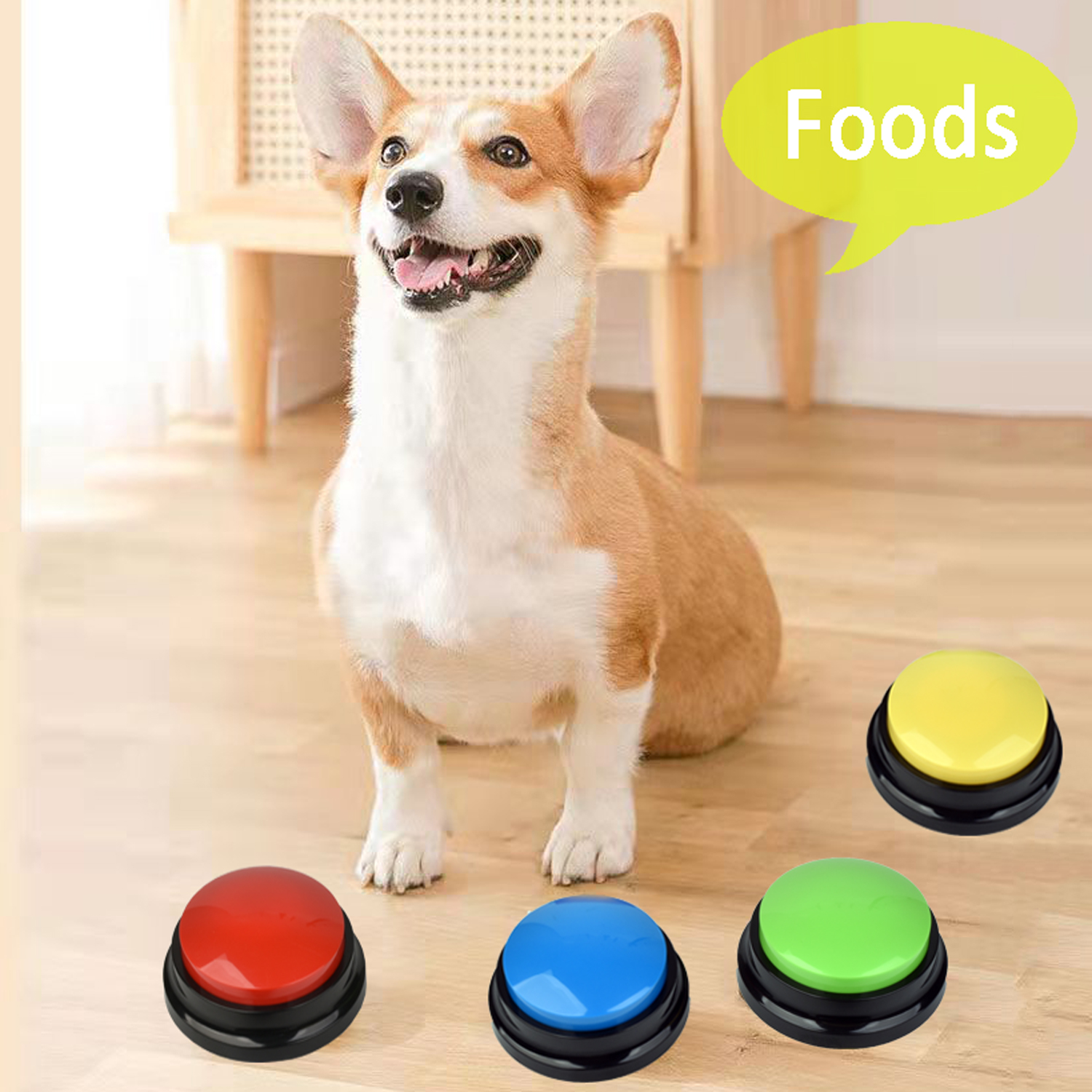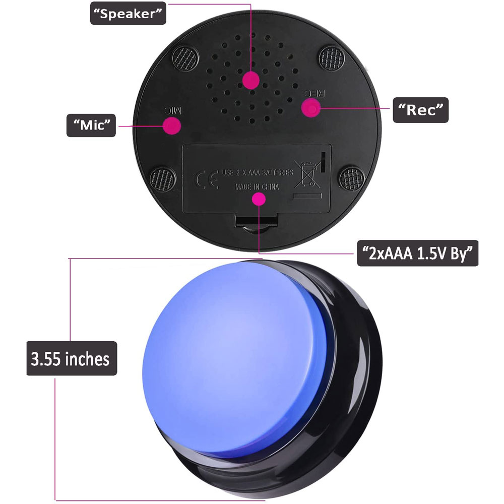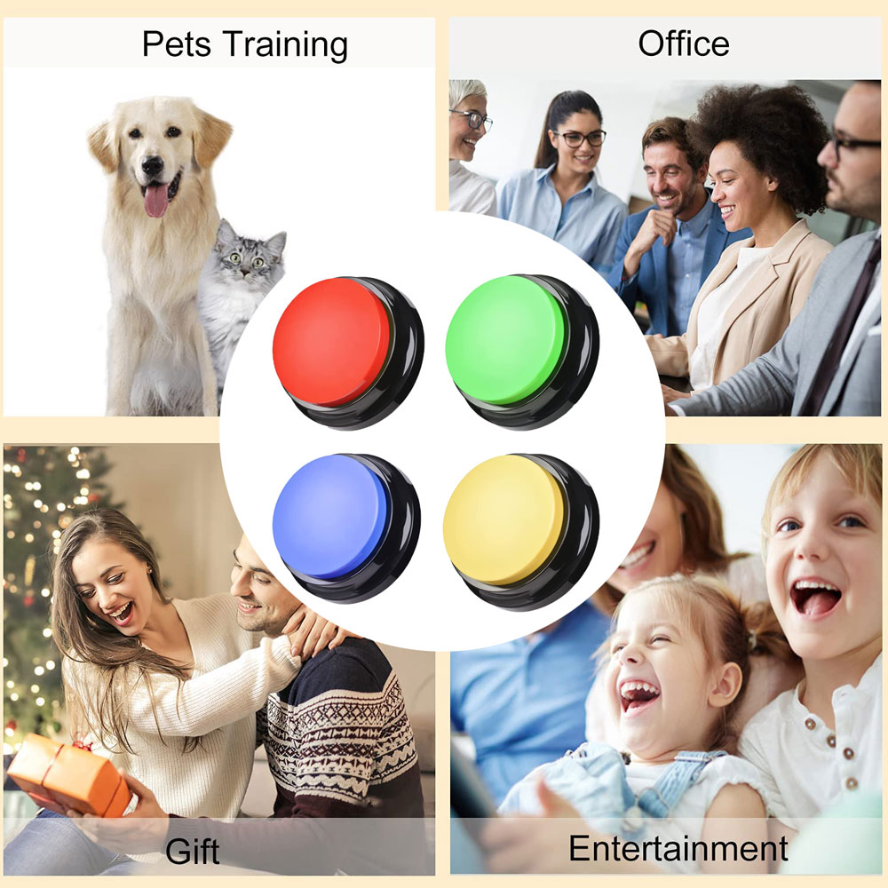 【Pet Training Buzzer】You can record commands such as "food", "drink", "outside", "yes" and "no" to let your pet communicate with you; just a little patience can make you understand the pet's mind. Very suitable for training cats, dogs and other pets, different color buttons can be used as options for different training.