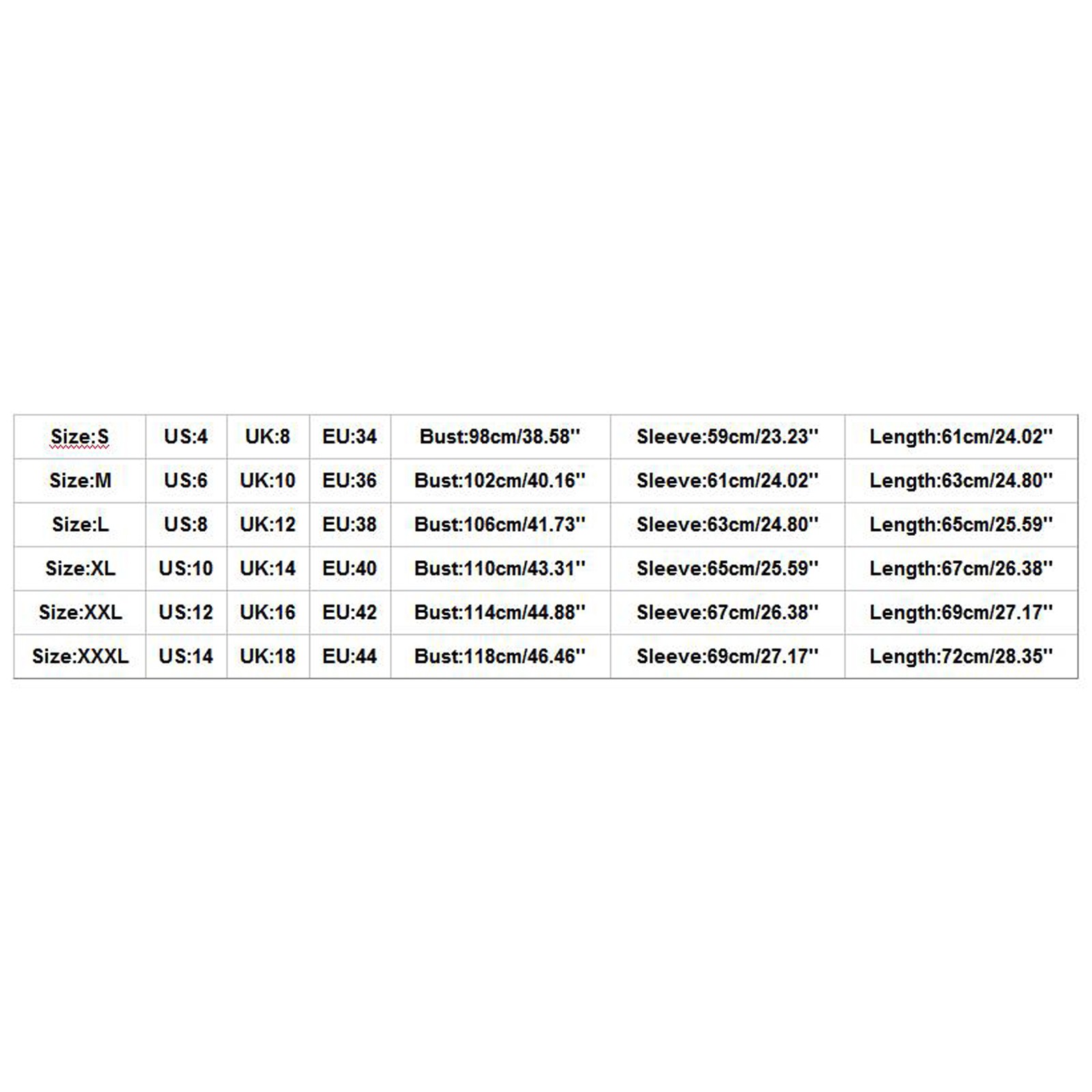| Size | US | UK | EU | Bust | Sleeve | Length |