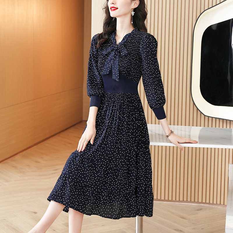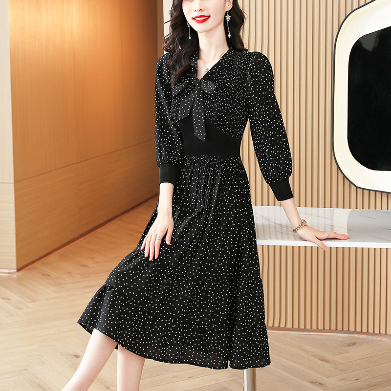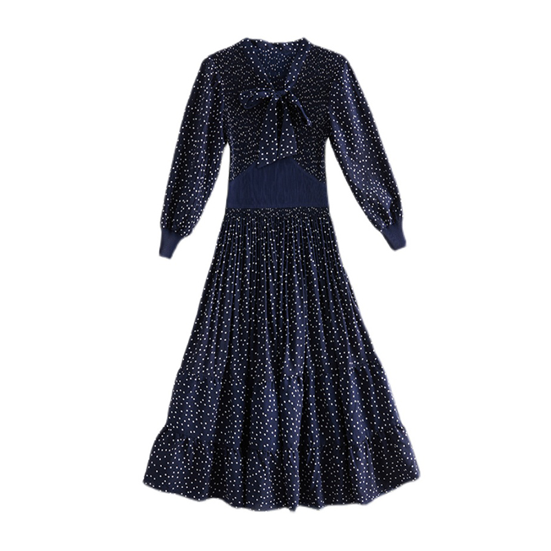 HUTI WJWYL New Arrival High Quality Black Polka Dot Midi Dress Spring Autumn Fashion Elegant Bodycon Pleated Dress Women Korean Vintage Casual Party Vestidos