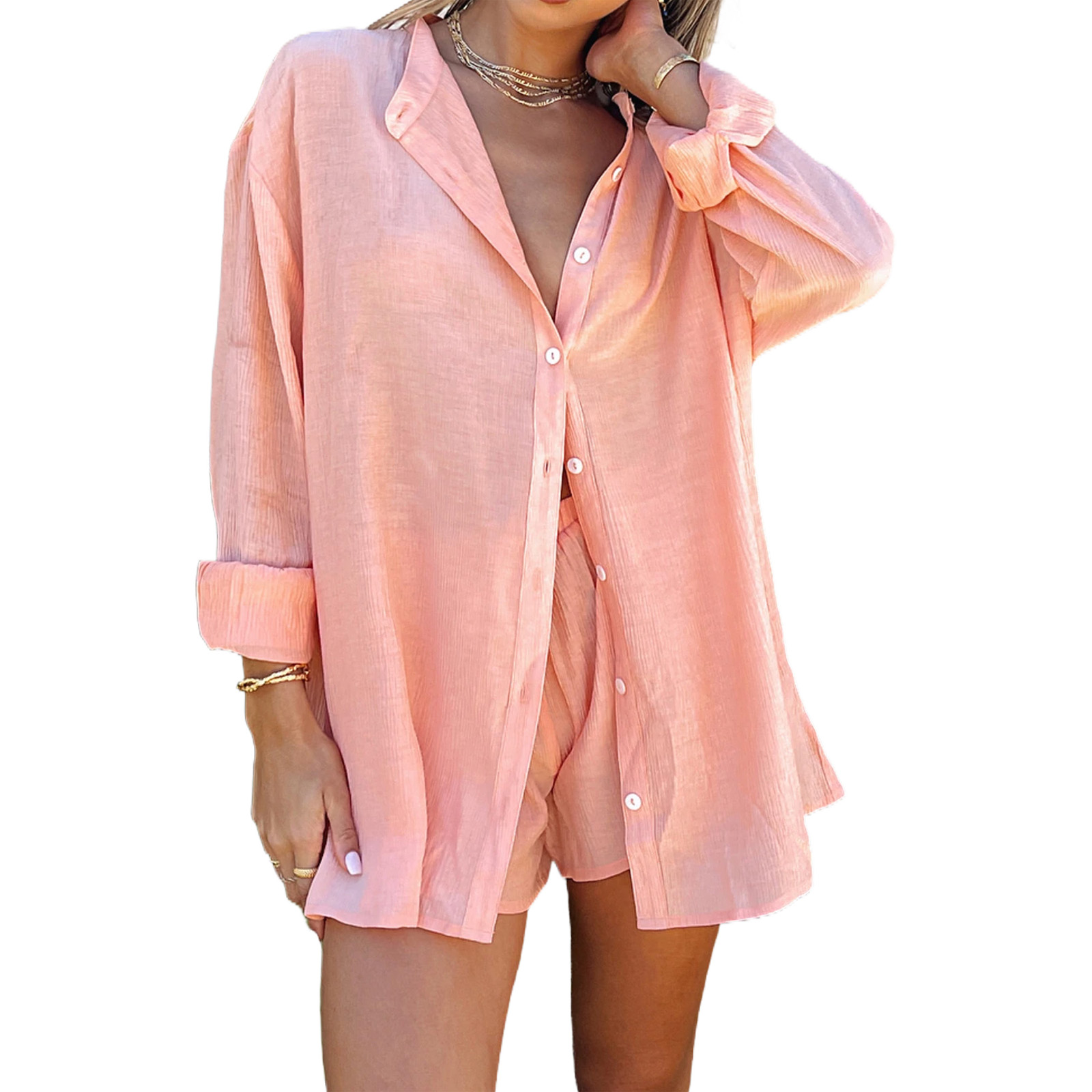 Women Solid Color Clothes Set, Half Sleeve Lapel Neck Button-up Shirt+Irregular Hem Drawstring Shorts